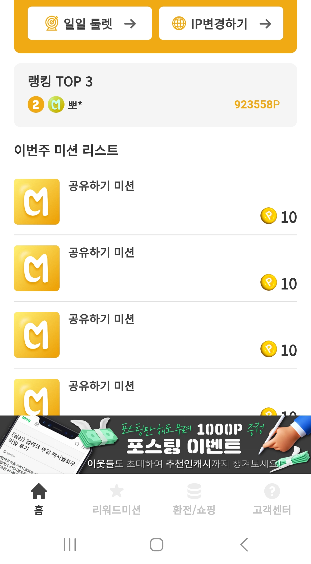TIP2. 추천인을 입력하고 시작하면 500원 얻고 시작할 수 있다. 미션 하나에 10원이다. 500원이면 얼마나 큰돈인가?