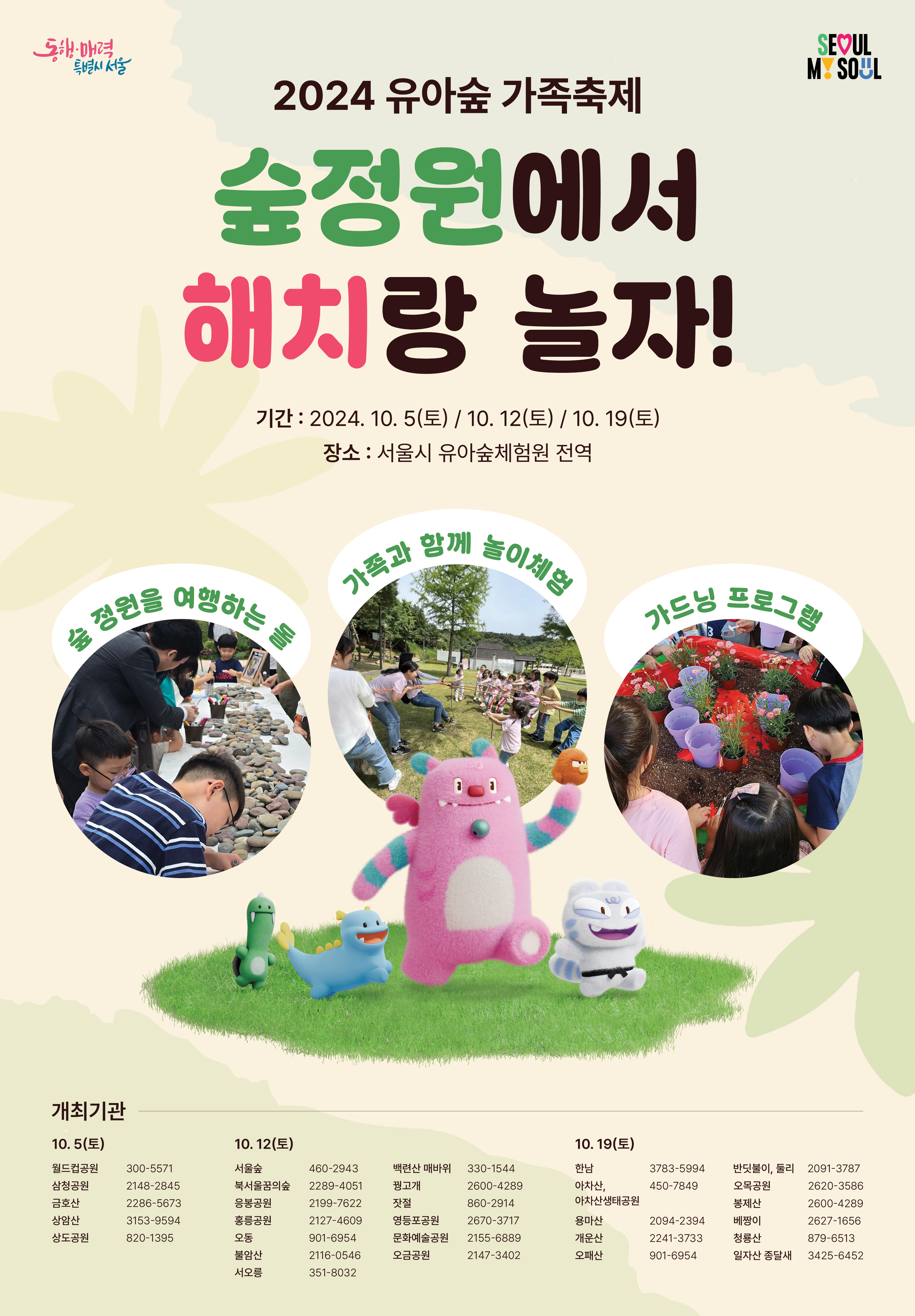 서울의 숲들에서 펼쳐지는 유아숲 가족축제입니다. 10월 5일 토요일부터 매주 토요일마다 숲에서 해치와 함께 놀 수 있는 숲체험 프로그램이 진행되며 참여 후기를 SNS에 올리면 모바일 커피 쿠폰을 지급하는 행사도 진행중입니다.