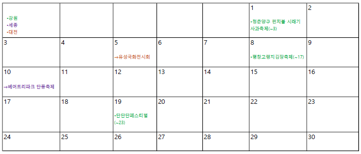 아쉽게도 달력은 조금 썰렁합니다만 지역 축제를 즐기고 또 그 지역에 가볼만한 명소를 함께 소개해드리면 어떨까 합니다.